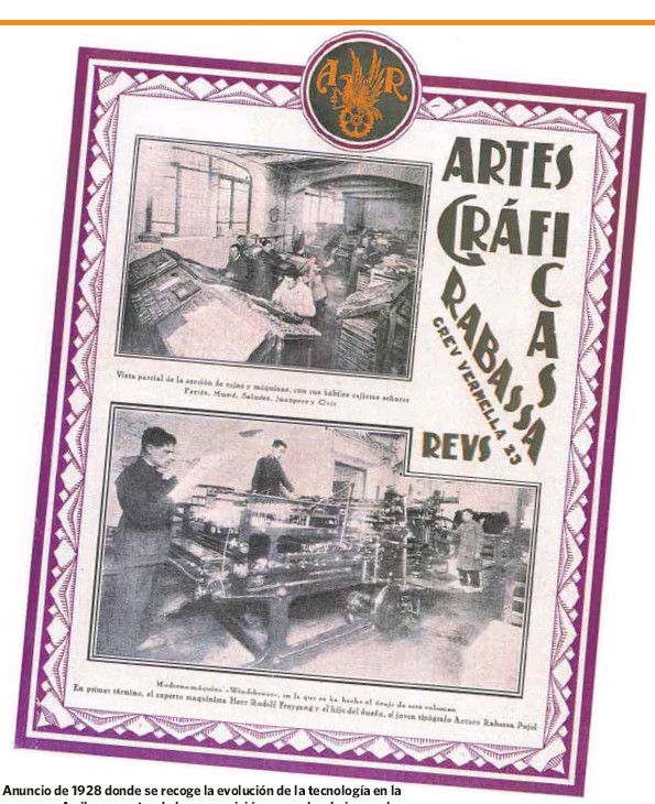 Anunci de 1928 on es recull l’evolució de la tecnologia en l’empresa. A dalt, mostra de la composició manual i avall, al centre de la imatge, Artur Rabassa Pujol, amb una màquina offset.